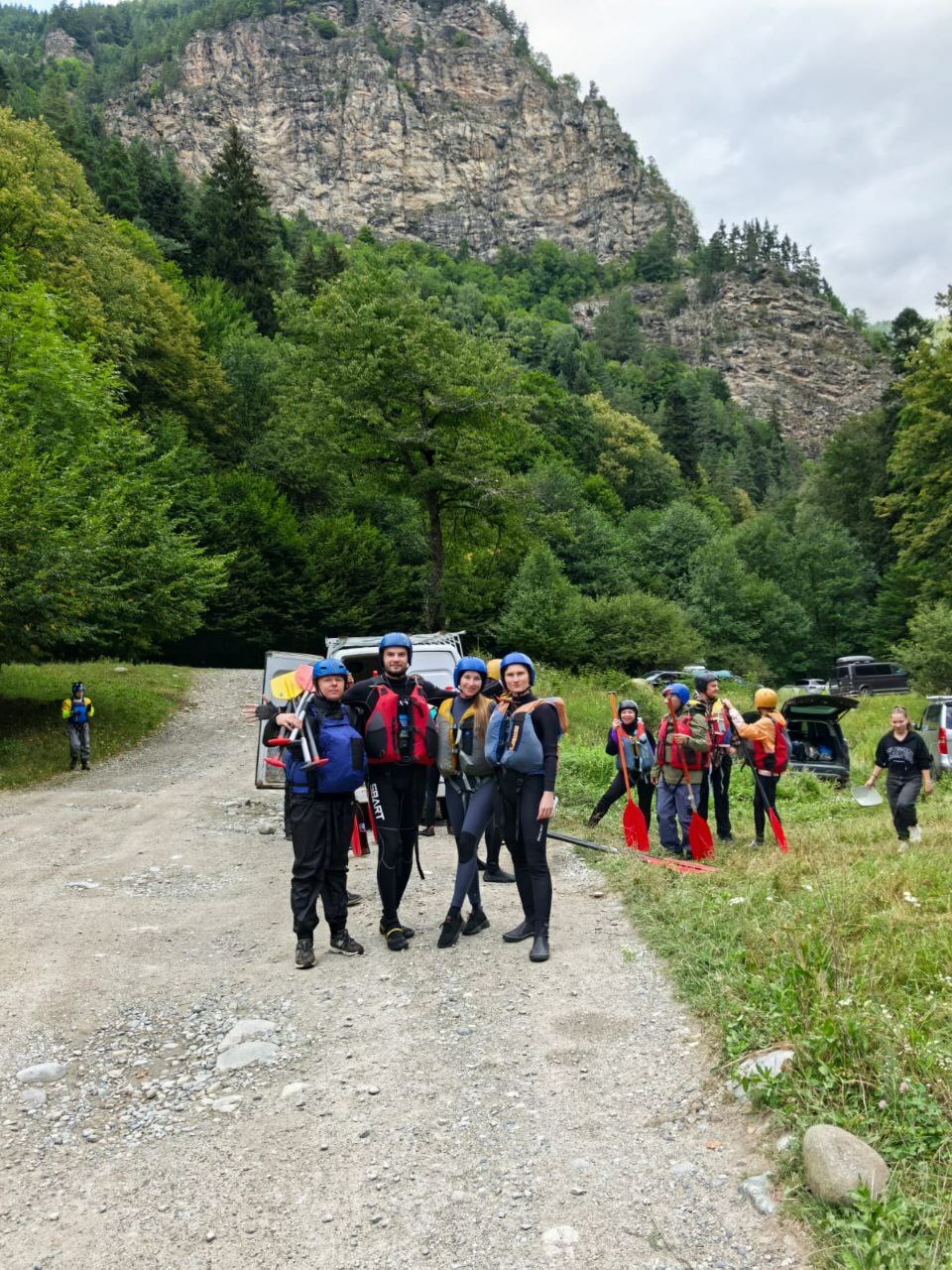 - Машины сопровождения и дорога вдоль реки (в любой момент есть доступ к цивилизацции - до связи, магазинов и пр. порядка 25-30 км)